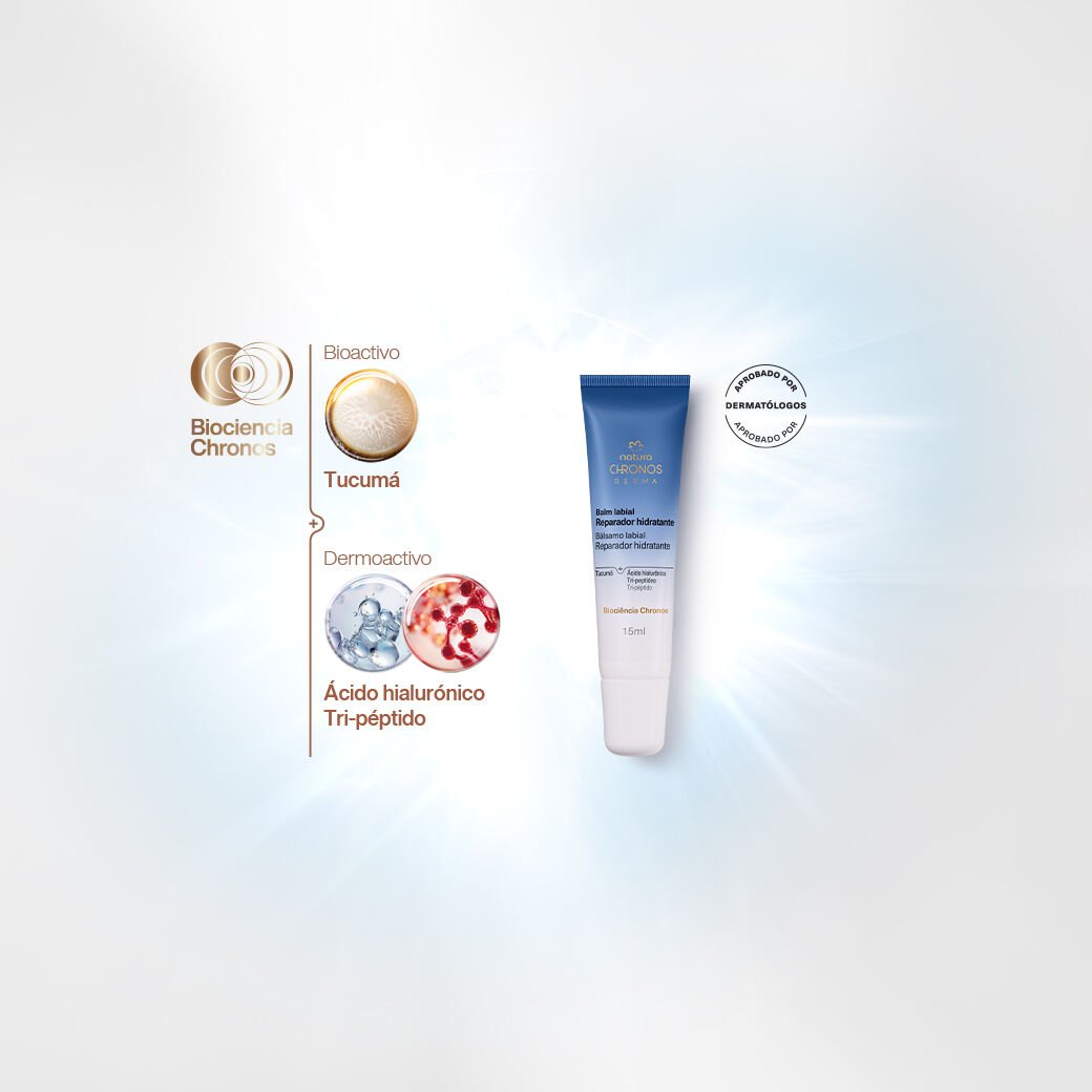 unión de potentes bioactivos de la naturaleza brasileña y eficaces dermoactivos. estos ingredientes activan la vitalidad celular y reducen los signos del envejecimiento. el Bálsamo Labial Reparador Hidratante Chronos Derma contiene Tukumá, Ácido hialurónico y Tri-péptido.