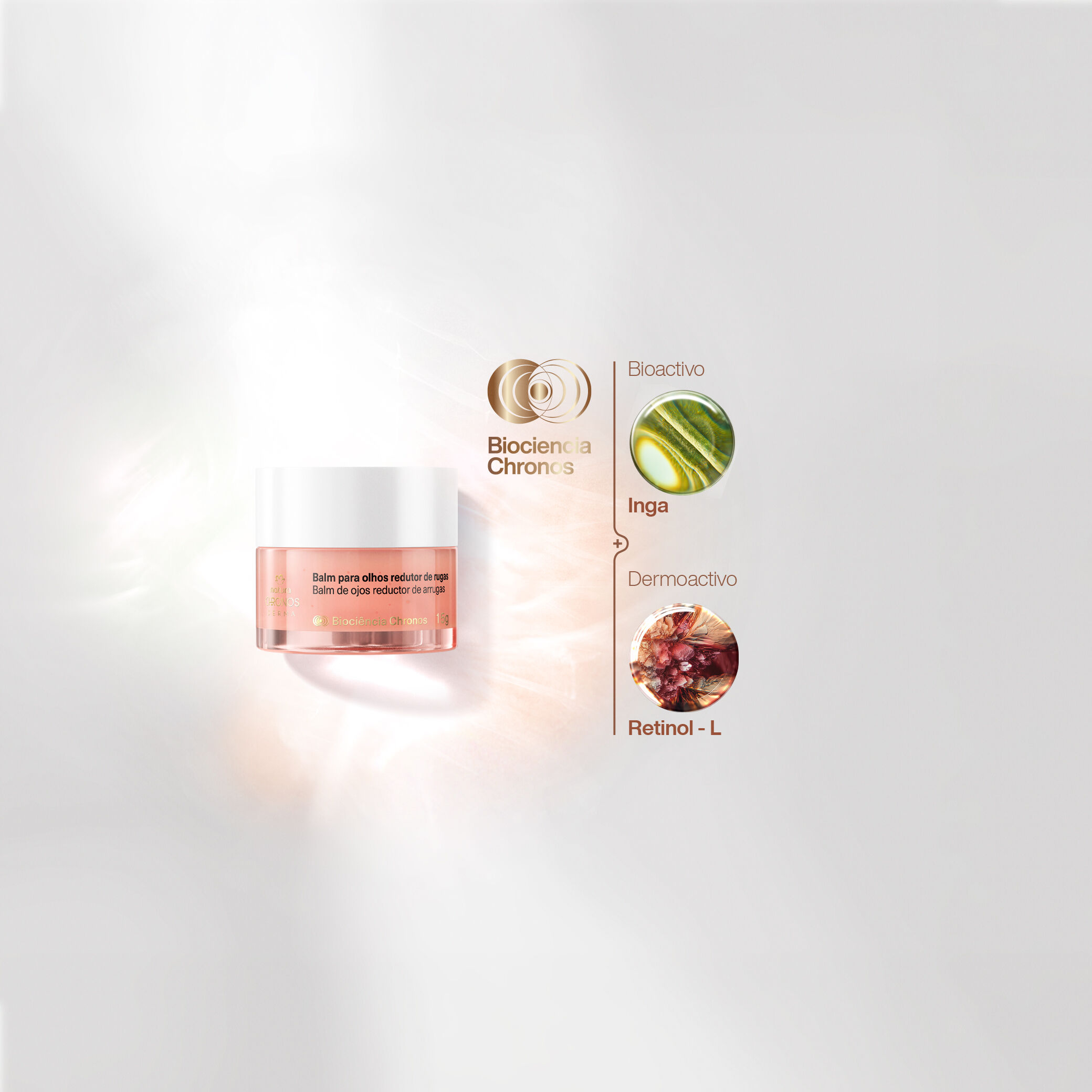 unión de potentes bioactivos de la naturaleza y dermoactivos para cuidar tu piel. el bioactivo Ingá trata la piel de la zona de los ojos, restaurando su capacidad de auto-regeneración. y el dermoactivo Retinol-L estimula el colágeno, mejorando la apariencia de líneas finas y arrugas.