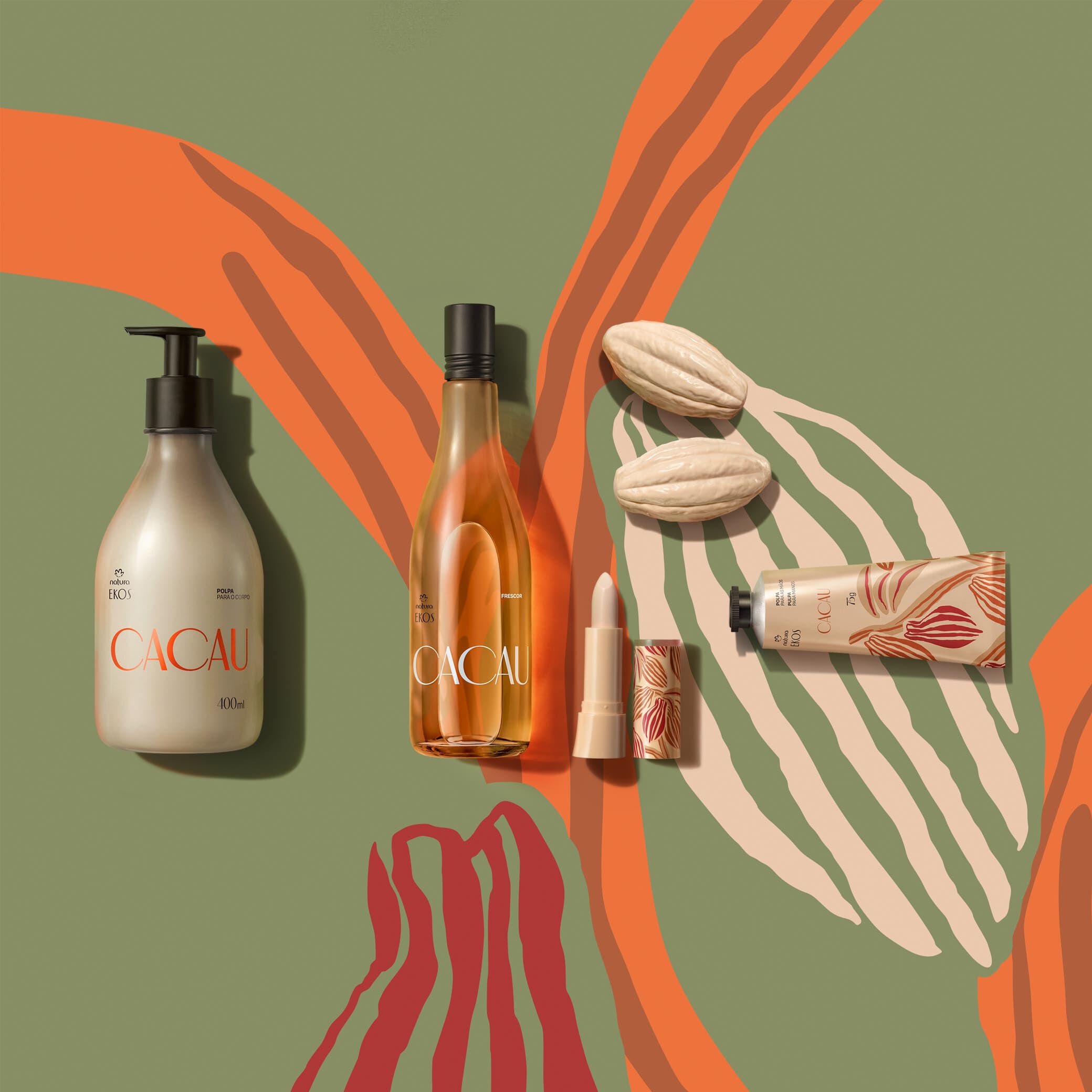 fórmulas con alto poder hidratante y una fragancia única que une cremosidad y frescura. productos que cuidan el cuerpo y generan ingresos para 150 familias guardianas. la línea Ekos Cacao se produce con la cosecha de almendras que adquirimos de la Cooperativa CEPOTX, en Pará - Brasil