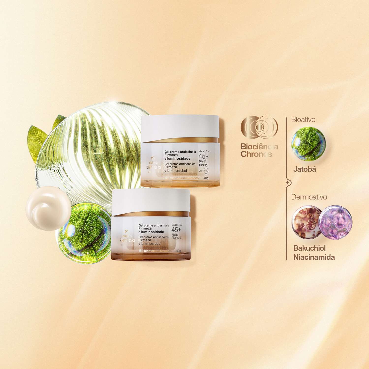 unión de potentes bioactivos de la naturaleza y dermoactivos para cuidar tu piel. el bioactivo Jatobá estimula el colágeno natural de la piel. mientras que los dermoactivos como el Bakuchiol y la Niacinamida reducen las arrugas y unifican el tono de la piel