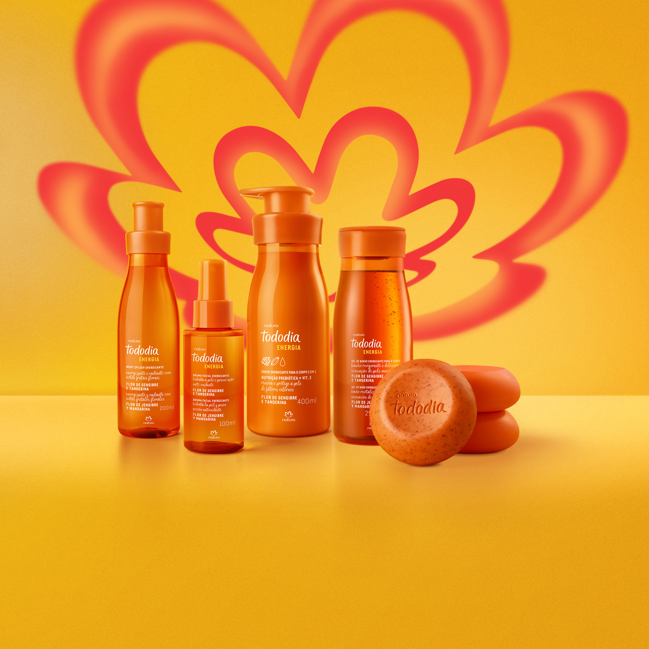 una línea de productos que promueve 7 veces más energía cuando se combina con rituales de cuidado y masaje. Tododia Energía renueva la piel, despertá los sentidos y activa el cuerpo con la fragancia Flor de Jengibre y Mandarina. más que un cuidado y un aroma delicioso, una vibración extra para tu día