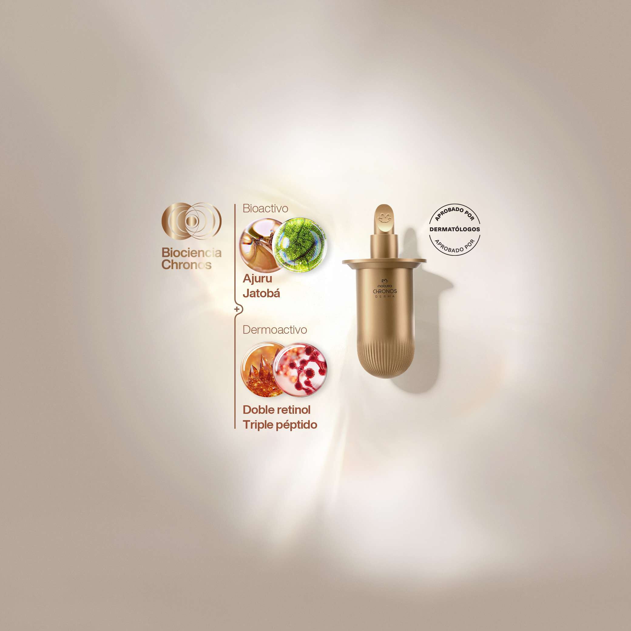unión de potentes bioactivos de la naturaleza y dermoactivos para cuidar de tu piel. los bioactivos Ajuru y Jatobá aumentan la producción, protegen y estimulan el colágeno. mientras que el dermoactivo Doble Retinol potencia la renovación celular y el Triple Péptido estimula los 3 principales tipos de colágeno de la piel.